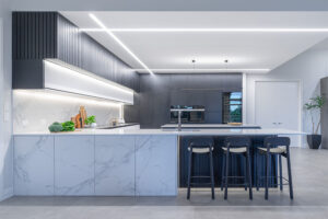 Genuine luxury balances beauty and usability. Smart sinks with integrated accessories, pull-out pantries, hidden bins, and seamless appliance zones streamline kitchens. Islands often double as social hubs, with built-in seating or multi-function zones for working or dining. As Leonie explains, “One shift I’m excited about is how kitchens are doubling as multi-use spaces. A lot of our clients are working from home more, so we’ve designed islands with hidden power points or casual seating that works just as well for Zoom calls as it does for family dinners. It’s luxury that adapts to everyday life.”